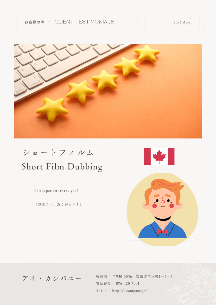 ナレーションだけでなく、映像制作の全工程をワンストップでご提供します。プロのテレビ制作チーム「i-company」との連携により、企画・撮影・ディレクションから編集まで、プロジェクト全体を一貫してサポート。お客様の手間を省き、高品質な映像作品をスムーズにお届けします。