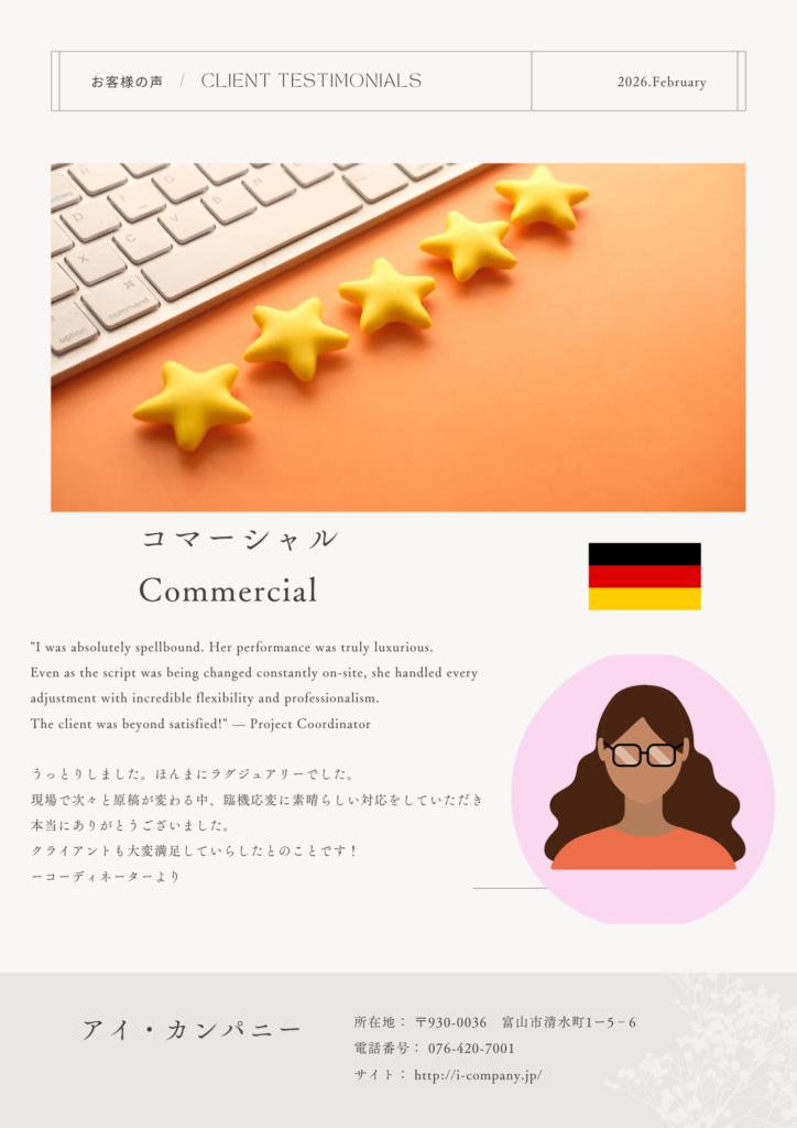 ナレーションだけでなく、映像制作の全工程をワンストップでご提供します。プロのテレビ制作チーム「i-company」との連携により、企画・撮影・ディレクションから編集まで、プロジェクト全体を一貫してサポート。お客様の手間を省き、高品質な映像作品をスムーズにお届けします。