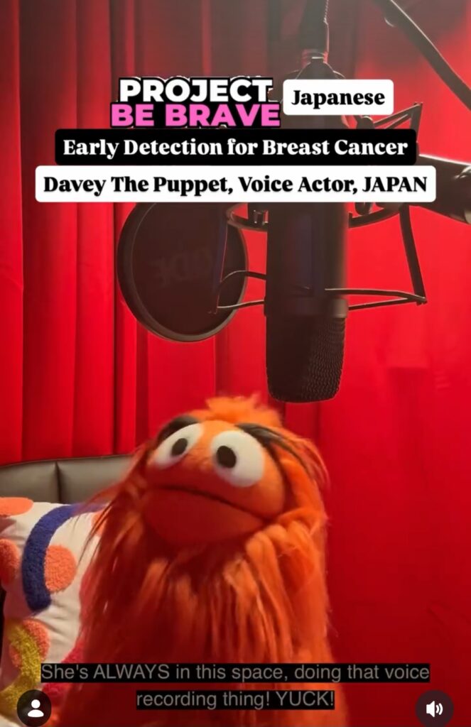 Tina reached out to voice talents across five continents, and more than 40 artists joined her cause. I was honored to provide the Japanese voice and introduce my dear friend Angela, who delivered the message in Mandarin. I also had the pleasure of dubbing the dialogue between puppeteer Cara and her character, Davey, into Japanese. By bringing their heartwarming interaction to life in my native language, we ensured this life-saving message reaches everyone, including children.